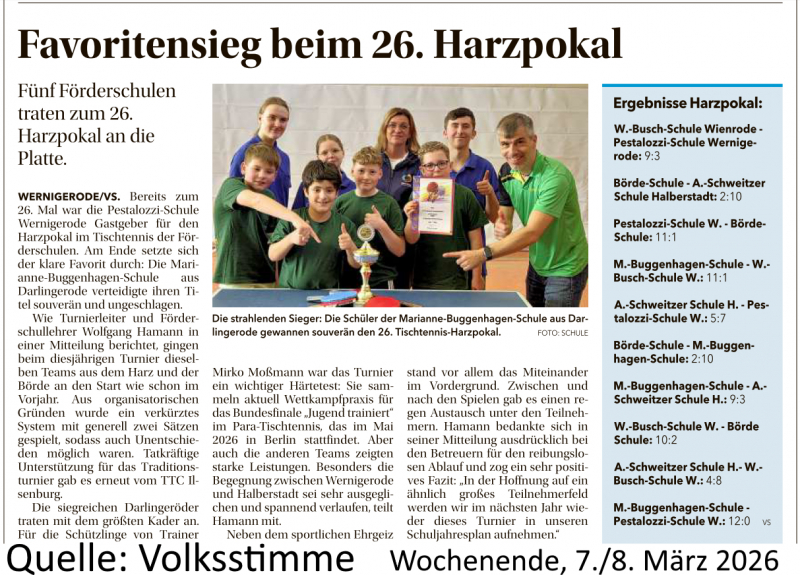26. Tischtennis Harzpokal in Wernigerode (März 2026)